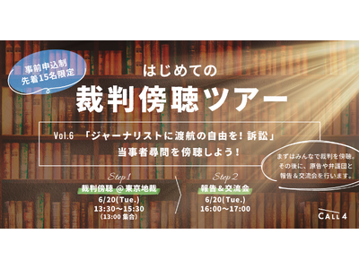日本初(※1)の公共訴訟支援に特化したウェブプラットフォームCALL4(コールフォー)(運営:認定特定非営利活動法人CALL4、代表理事:谷口太規)は、2023年6月20日に東京地方裁判所で行われる「ジャーナリストに渡航の自由を!訴訟」の東京地裁での第15回期日を、CALL4メンバーと傍聴する法廷傍聴ツアーの参加募集を6月7日より開始いたします。