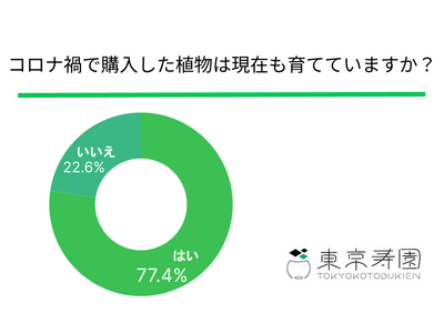 「コロナ禍で購入した植物は現在でも育てていますか?」という質問に、「はい」と回答した方は77%いました。