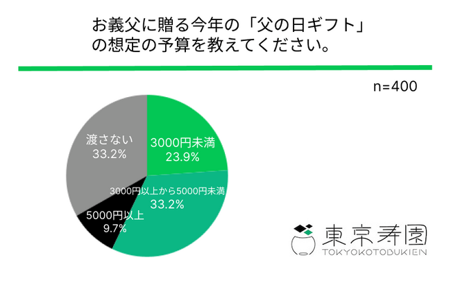 「お義父に贈る今年の「父の日ギフト」の想定の予算を教えてください」、「実の父親に贈る今年の「父の日ギフト」の想定の予算を教えてください」という質問では、実の父親の予算とお義父の予算は「3000円以上から5000円未満」と似た結果となりました。また、「渡さない」と回答した方も「33%」いました。