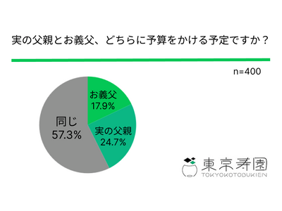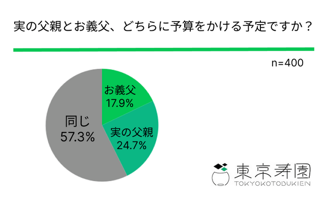 「実の父親とお義父、どちらに予算をかけますか?」という質問に、実の父親と回答した方が「24%」、お義父と回答した方は「17%」、同じと回答した方は「57%」いました。半分以上の方が予算は同じと回答しており、実の父親とお義父のプレゼントで差をつけていることはないことがわかりました。