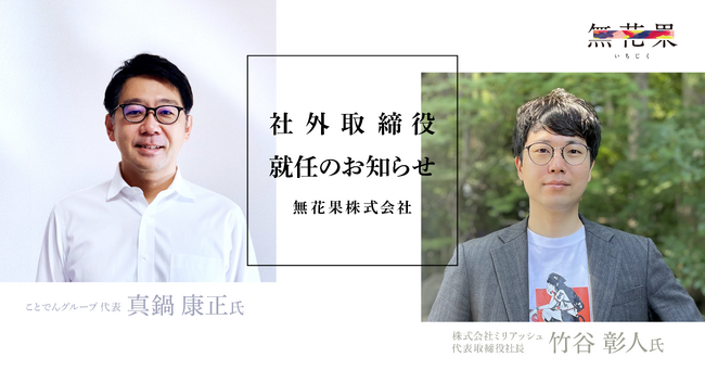 無花果株式会社(所在地:岡山県岡山市 代表取締役:中藤 寛人)は、ことでんグループ(所在地:香川県高松市 代表:真鍋 康正)の真鍋 康正氏と、株式会社ミリアッシュ(所在地:東京都府中市 代表取締役:竹谷 彰人、以下「ミリアッシュ」)の竹谷 彰人氏が、社外取締役に就任したことをお知らせします。