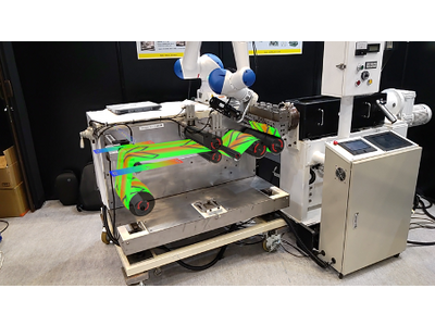 高機能のフィルムやシートをつくるため、樹脂を平らに成形する工具「Tダイ」を完全オーダーメードで設計・制作する、町工場ベンチャー・アクスモールディング株式会社(本社:東京都大田区、代表取締役社長:横田新一郎、以下「当社」)はVR(Virtual Realityの略:仮想現実)を用いて熟練技術者から経験の浅い技術者に技術の伝承を素早く、簡単にできるようになる「VRとロボットを組み合わせた訓練システム」を開発し、6月から本格稼働させます。(※ 下図の緑のフィルム状の部分がVRによる映像で、上部がロボット)