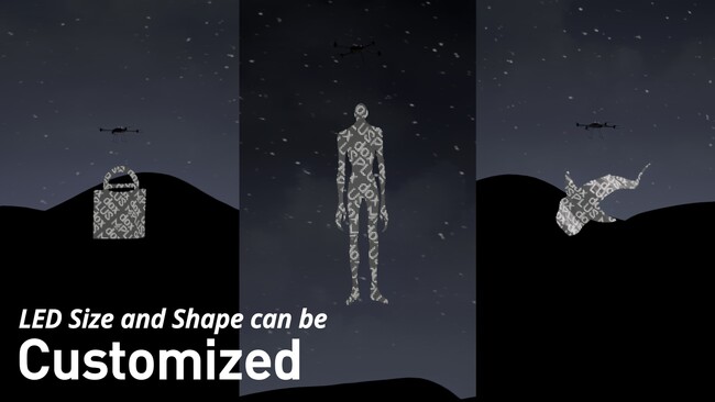 今回発表したLEDの布ディスプレイのサイズは縦6.8m横2.6mで、フルカラーLED17,280個を搭載。 取り付けたLEDの仕様をはじめ、無線LED制御デバイス、バッテリーなど全て自社で設計・製作しています。今回製作した布ディスプレイ以上の大きさや、より細かいLEDピッチでの製作も可能です。また、形状をカスタマイズすることも可能で、人型や商品のシルエットをかたどった空飛ぶディスプレイを製作することができます。