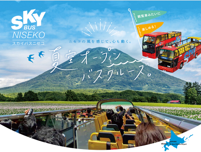 一般社団法人倶知安観光協会は、夏の本格的な観光再開を目指し、日の丸自動車興業(東京)からオープントップのバスをリースし、地元のバス会社で運行する「スカイバスニセコ」を 7 月 15 日から運行開始します。昼間は「ニセコパノラマ号」、夜は「ニセコナイト号」として 1 日最大 16 便をシャトル型で運行、今季は外国人観光客向けの英語・韓国語・北京語・広東語の音声ガイドシステムを導入します。