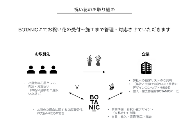 各社が別々に発注し別々に会場に届く祝い花を、BOTANICが一社取りまとめで実施。会場を彩る装飾としてお祝いの花を表現し、会期後には関係者に花束として配布することで花の鑑賞価値を最大限活かす取り組み