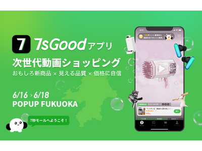 7sGoodは、“7秒で生活を世界とつなぐ”をテーマに、Goodクオリティ・Goodプライスにこだわった、おもしろ商品10万点を取り扱う、次世代型動画ECアプリです。この度、7sGood及び、アプリ内で展開するユニークな商品の魅力を知ってもらうべく、日本初のポップアップイベントを福岡・天神のソラリアプラザ1Fゼファにて、6月16日(金)~6月18日(日)に実施いたします。