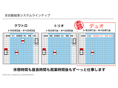 全自動結束システム「DUO」は、従来ラインナップよりも手軽さと結束範囲を広くした、オペロボ・トモロボ各1台ずつで行う方法になります。結束数は従来ラインナップよりも少なくなってしまいますが、トモロボの結束範囲が広くなることで、後にオペロボが移動している箇所を人が結束する際に作業範囲を減らすことができます。また、ロボットの準備は2台だけなので単純に設置等が容易になります。