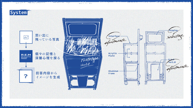 本コンテンツは、AI技術によって、画像といくつかの質問から夢のイメージを生成するシステムREM(Re-Dreaming Emulating Module)を使ってあなたが今晩見るであろう夢をビジュアライズする実験的な体験コンテンツです。高性能画像生成AIにより、体験者の思い出に残っている写真をベースに、個々の記憶と深層心理を探る質問に回答してもらうことで、現在-過去-心理に大きく3構成に分けてモーフィングでイメージを生成します。