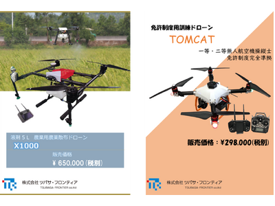 弊社は5L液剤農業用農薬散布ドローンの販売を開始いたします。小型・軽量で扱いやすく自動散布が可能な当社製品は、農作業の省力化、効率的な農業生産を支援します。また、弊社は一等・二等無人航空機操縦士免許制度に完全準拠した、訓練用ドローン「TOMCAT」を販売いたします。