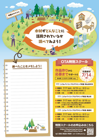 コンテストを運営するレプタイル株式会社が毎年おこなっている作品制作から応募までをサポートするOTA特別スクールや、岡山県北の小学校を中心に木育とプログラミングの出前授業もおこないます。