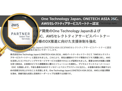 株式会社One Technology Japan(本社:神奈川県川崎市、代表取締役:河本直己、以下:当社)とパートナー企業であるONETECH ASIA JSC(本社:ベトナムホーチミン市、代表取締役:グエンラムタオ)は6月20日(火)にアマゾンウェブサービス(以下、AWS)のパートナーネットワーク(以下、APN)において、「AWSセレクトティアサービスパートナー」に認定されました。