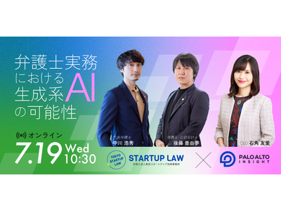 東京スタートアップ法律事務所代表弁護士の中川浩秀と、スタートアップ・ベンチャー法務を主軸に活躍する弁護士・公認会計士の後藤亜由夢が、これまで100社を超える日本企業へ最先端のAI導入やDX支援を行ってきたパロアルトインサイトのCEO石角友愛(いしずみ・ともえ)氏をお招きし、『弁護士実務における生成系AIの可能性』と題する無料オンラインウェビナーを2023年07月19日(水)10時30分より開催致します。