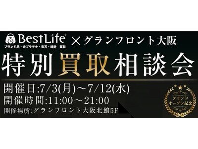 活かそう資源・活かそう人財を理念に、地域のみなさまの生活の中に「リユース」という価値を提供する、株式会社ベストライフ(本社:大阪府大阪市 代表取締役:岩本元熙)が運営する買取専門店「BestLife」の関西旗艦店であるグランフロント大阪店が、7月3日(月)から「特別買取相談会」を開催