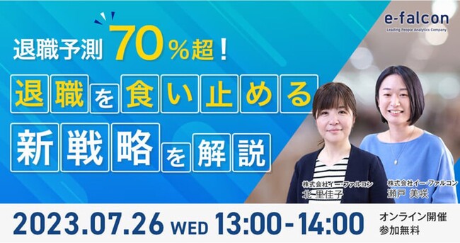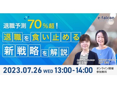 業界トップクラスの測定項目数でタレントマネジメントに活用できる適性検査『eF-1G(エフワンジー)』を提供する株式会社イー・ファルコン(本社:東京都中央区、代表取締役社長:田中伸明)は、過去に適性検査『eF-1G』の受検歴がある退職者1万件以上のデータを元に退職防止策を提案する『退職予測70%超!退職を食い止める新戦略を解説』セミナーを2023年7月26日(水)にオンラインで開催します。