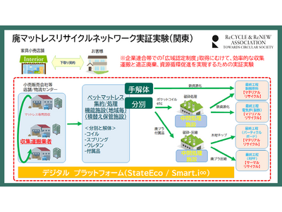 今回の実証実験は、廃棄ベッドマットレスの運搬における経路最適化と廃棄物の処理状況の可視化を検証します。R&R協議会に参画している排出事業者の廃棄ベッドマットレスのサイズ・枚数・重量などの情報を集約し、トラック1台当たりの積載量が最大となる回収経路で配送します。StateEcoは、情報を一元的に集約、廃棄物の回収から最終処理までを可視化し、リアルタイムに状態の確認ができるプラットフォームで、AI(人工知能)も活用して時間と費用の両面で最適な運搬経路を算出します。