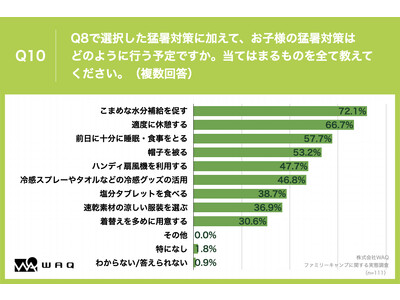「Q10.Q8で選択した猛暑対策に加えて、お子様の猛暑対策はどのように行う予定ですか。当てはまるものを全て教えてください。(複数回答)」(n=111)と質問したところ、
