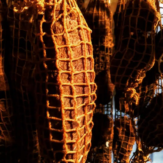この革新的な「ベーコン節(R)︎」は、北海道産の豚肉を数週間氷温熟成させた後、オーク材で数日間燻煙し、さらに4ヶ月以上熟成させるという特別な工程を経て生まれます。その産出量は、4kgの原材料からわずか1kgに満たないものとなります。この製造過程により、脂肪の少ない部分に熟成された旨みが凝縮され、一般的なベーコンとは一線を画した風味を提供いたします。(※弊社製造のベーコンは、食のミシュランと呼ばれる国際味覚審査賞で国内で唯一三つ星を連続受賞しております)