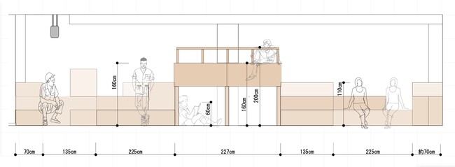 まちづくりでしばしば見られる階段ベンチという設計モデルは、座る場所を自分で決めることができ、段差ごとに利用者の目線の高さや向きにバラつきを生むため、今回のユースセンターのデザインに最適なアイデアだと考えました。