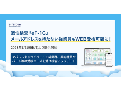 株式会社イー・ファルコン(本社:東京都中央区、代表取締役社長:田中 伸明)は、業界トップクラスの豊富な測定項目数でタレントマネジメントに活用できる適性検査『eF-1G(エフワンジー)』が、メールアドレスを持たない従業員でもWeb受検いただけるよう機能アップデートしたことをお知らせします。