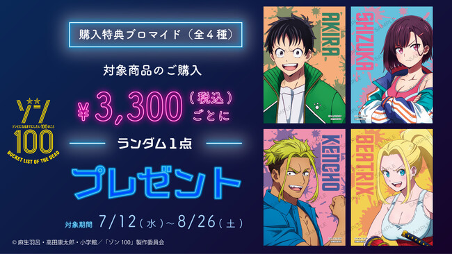 販売期間中(2023/7/12~8/26)、TVアニメ『ゾン100~ゾンビになるまでにしたい100のこと~』の合計注文金額3,300円(税込)お買い上げごとにランダムで特典(全4種)を1点プレゼントいたします。