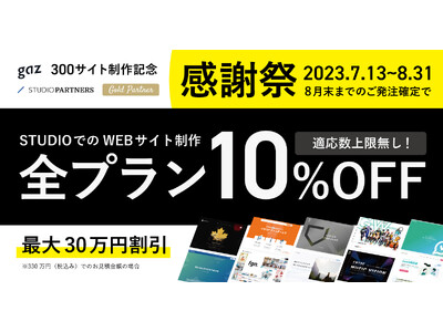 唯一のSTUDIO Gold Partner(*2)株式会社gazは、Webサイト制作事業において300サイト*を制作した記念として、全プランを対象とした10%OFFキャンペーンを実施いたします。