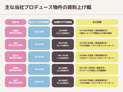 これまで当社がプロデュースした物件は、ほぼ全ての物件で付加価値創造による賃料向上を実現させてきました。
