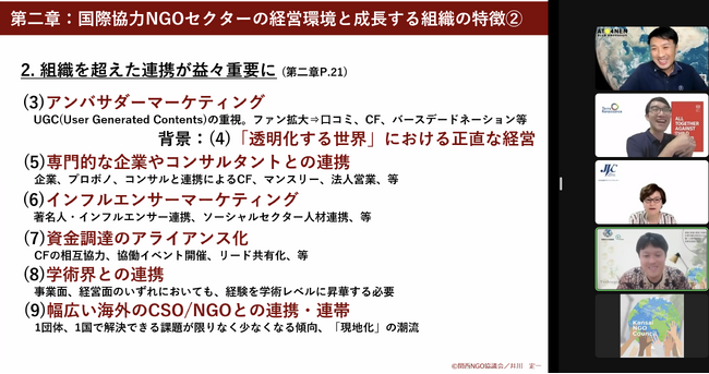 セッションでは、2022年度外務省NGO研究会「日本の国際協力NGOの資金調達リデザイン化と財務内容の強化」の調査報告に基づき「時代適合性」、「収益モデル」、「ファンドレイジングへの投資」、「成長している組織の25のキーワード」の考察や実践方法の情報を提供しています。