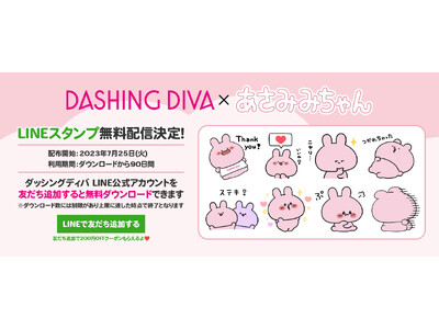 あさみみちゃんとの初コラボLINEスタンプ全8種類は、ダッシングディバの LINE公式アカウントを友だち追加していただくと先着で無料ダウンロードが可能です。当LINE公式アカウントでは、新商品のご案内に加え、クーポンやお得なキャンペーンなどの情報を配信しております。