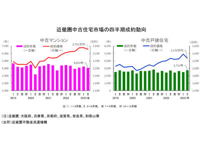 (公社)近畿圏不動産流通機構が7月21日に発表した2023年4~6月期の近畿圏の中古マンション成約件数は、4,052件(前年同期比マイナス6.8%)と3期連続で減少し、市場の売り出し(新規登録)件数は15,798件(前年同期比プラス19.7%)となりました。成約件数は近畿圏の対象12地域中6地域が前年比で減少し、北摂や神戸市、京都市は2ケタ減となるなど、軟調なエリアも多くみられました。
