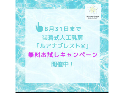 しかし、三鷹のサロンまではなかなか遠くて行けないけれども人工乳房に興味があり製品を触ったり試着してみたいという全国からお客様のご要望をいただき、8月31日お申込までの期間限定で、装着式人工乳房「ルアナブレスト(R)」を無料でお試しいただけるキャンペーンを開始致しました。