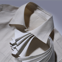「着心地がいいだけではなく、着るだけで一日がうまくいくような最高の気分になる。」そんなシャツを作りたい。という松田の熱意に呼応するかのように、大野氏も美しいスタイルのシャツの模索を始めました。立体的な構造がもたらす動きやすさや着心地を追求しながら、鏡を前にした時に「よし」と自信を持てるように、もっとも美しく見えるように、丹精込めて作り上げました。開発には4年以上の期間を要し、特に顔の印象を決める襟周りのデザインには、100回以上の試作が行われました。
