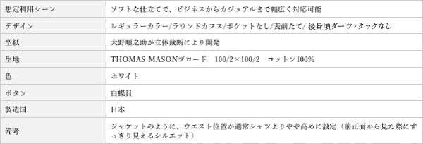 裁断・縫製は日本の職人が丹精込めた手作業で行い、細部の作業まで一つ一つ丹念に作り込んでいます。また生地は世界最古の生地メーカーであるトーマスメイソン社の美しい光沢と耐久性を備えた実用性の高いコットン100%の生地で、ニューヨーク式立体裁断の羽織るような軽さを実感できるように目の詰まった動きの少ないブロードをセレクトしました。