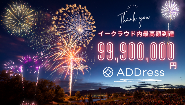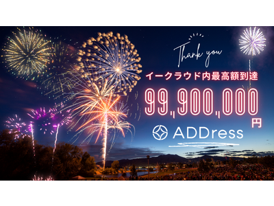 ADDressへの申込額が9,990万円に到達したことで、株式投資型クラウドファンディングの国内最高額を更新し、イ―クラウド内のこれまでの最高額(6,417万円)も大幅に上回りました。加えて、申込み受付の開始後、約46分で目標募集額の3,000万円に到達しており、イークラウド内でのこれまでの目標募集額の最短到達記録(約75分で980万円)を更新しました。