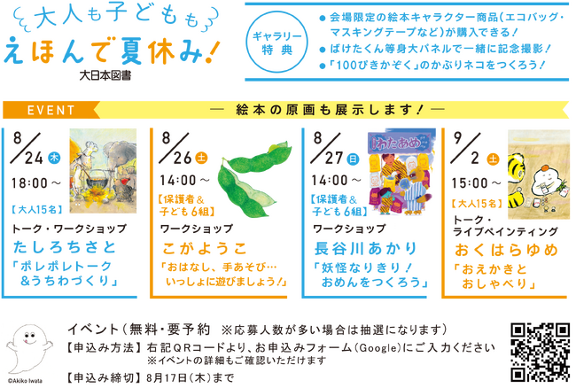 大人気の絵本作家を招いて、親子向けのワークショップや大人向けのトーク、ライブペインティングを行います。また、絵本の原画展示、絵本キャラクターの限定グッズ販売など、様々な来場者特典をご用意しました。夏休みの1日、ぜひ、遊びに来てくださいね~。