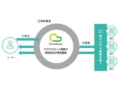 「クラウドローン」は、貸し手である銀行と借り手である個人を、オンラインでつなぐマッチングプラットフォームです。ユーザーは与信審査の情報登録を行うことで、事前に提携先銀行ローンの保証審査を、クラウドローン提携の保証会社が一括で行い、「借りられるローン」の中から選択し申込することができます。