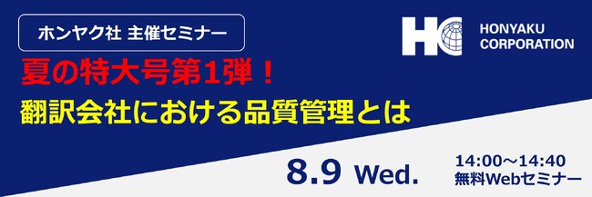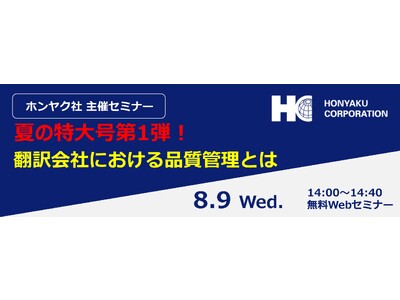 産業分野に特化した翻訳・機械翻訳サービスを展開する株式会社ホンヤク社(代表取締役:原田真)は、『翻訳会社における品質管理とは』と題した無料Webセミナーを2023年8月9日(水)に開催します。