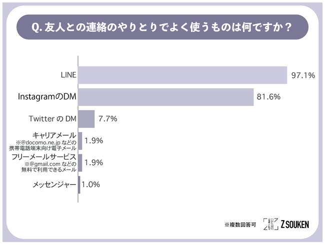 アンケートにて「友人との連絡のやり取りでよく使うものは何ですか?」と尋ねたところ、「LINE(97.1%)」と「InstagramのDM(81.6%)」が大半を占める結果となりました。