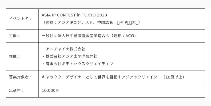 アニチャイナ株式会社(本社:東京都渋谷区)は、8月3日から始まる日本と中国の合作キャラクターデザインコンテスト「ASIA IP CONTEST in TOKYO 2023(IPコンテスト)」に共催企業として参加いたします。