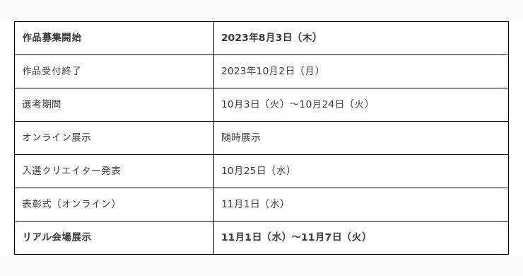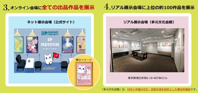 本コンテストではオンライン、リアルの2つの会場で同時開催します。オンライン会場では全ての作品がもれなく展示され、リアル展示会場ではプロに選ばれた上位約100名の作品が展示されます。