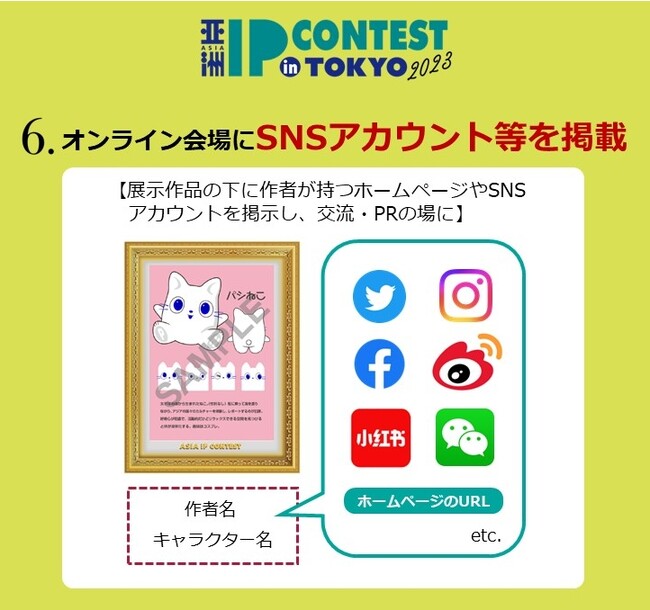 オンライン会場には全ての応募作品が展示されます。今回は多くの企業、クリエイターに見られる場だからこそ、作品に参加クリエイターのSNSやホームページをもれなく掲載し、ビジネスチャンスへ繋げることもできます。