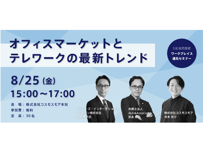 働く場をつくるオフィス事業を展開する株式会社コスモスモア(本社:東京都渋谷区、代表取締役社長:枝廣 寿雄、以下「コスモスモア」)は、2023年8月25日(金)に、コリアーズ・インターナショナル・ジャパン株式会社、弁護士法人ALG&Associatesと3社合同で「ワークプレイス進化セミナー:オフィスマーケットとテレワークの最新トレンド」を開催いたします。