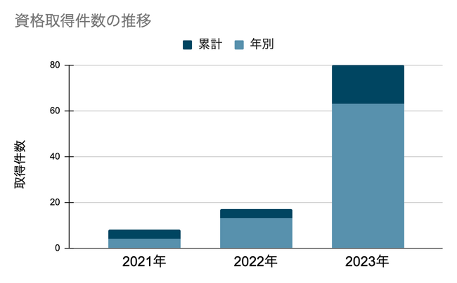 資格取得を目的とした勉強会を社員が開催。過去問対策から実際のハンズオンまで実施し、部署・年次を超えたメンバーが集まり学習意欲の向上にも貢献。6月に所属者全員がベンダー資格を取得するなど、2023年の資格取得件数が5倍を記録する要因の一つになっている。