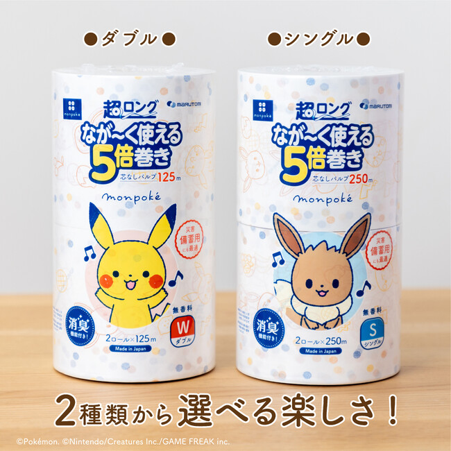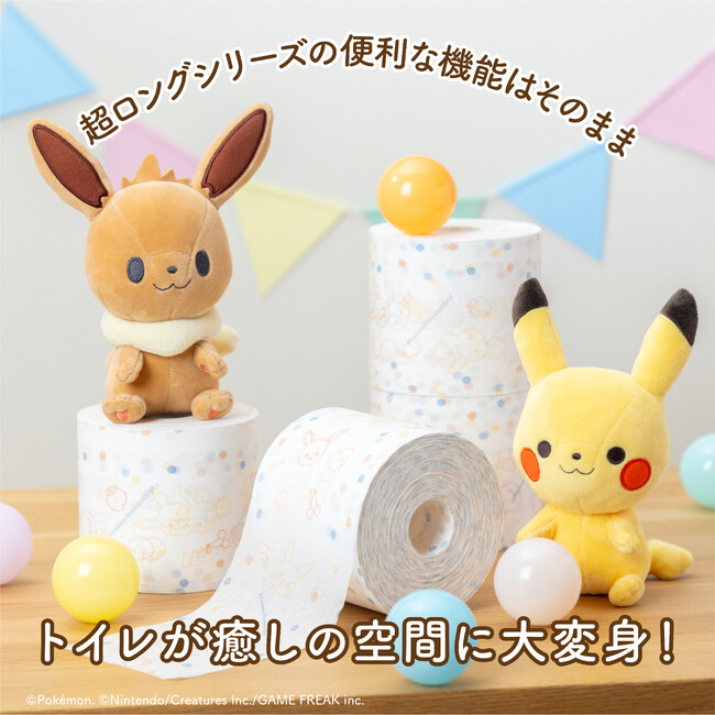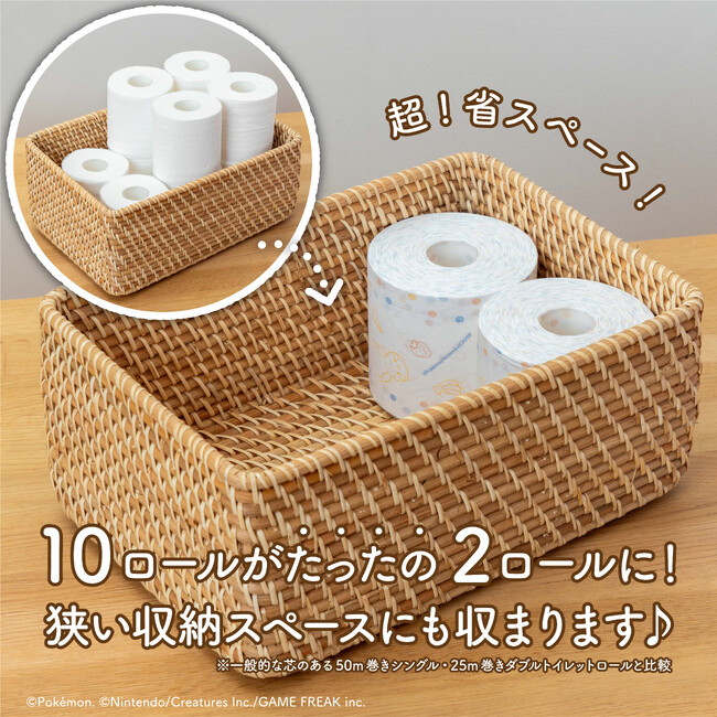 2ロールで一般的なトイレットペーパー10ロール分に相当(※)するコンパクト設計なので、持ち帰りも保管も省スペース。超ロングシリーズの便利な機能はそのままに、ポケモンたちがトイレ空間を鮮やかに彩ります。
