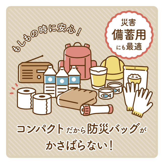10ロール分をたったの2ロールで賄える(※1)ため、もしもの時の防災・備蓄用にも用意しておけば安心です。嵩張りがちな備蓄の収納スペースにもすっきりと収めることが可能です。