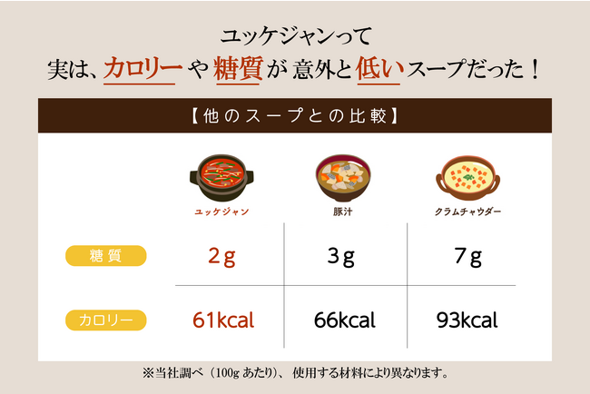 作り方によって数値は異なりますが、牛肉やぜんまい、豆もやしなど低糖質な食材を中心とした料理で、豚汁やクラムチャウダーと比較すると意外とヘルシーなスープ料理と言えます。