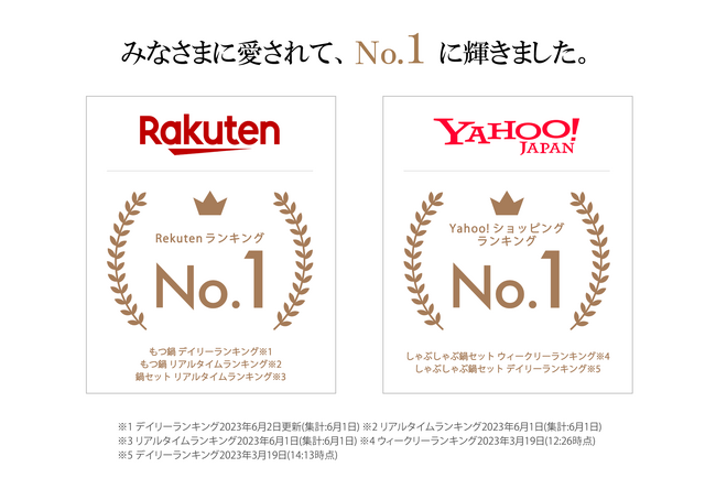 楽天市場やYahoo!ショッピングでは、もつ鍋・しゃぶしゃぶ・参鶏湯でランキング1位を獲得。