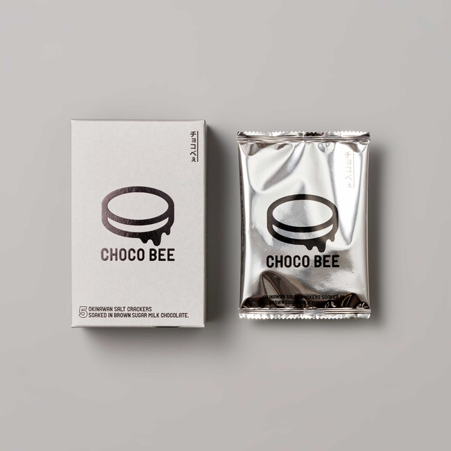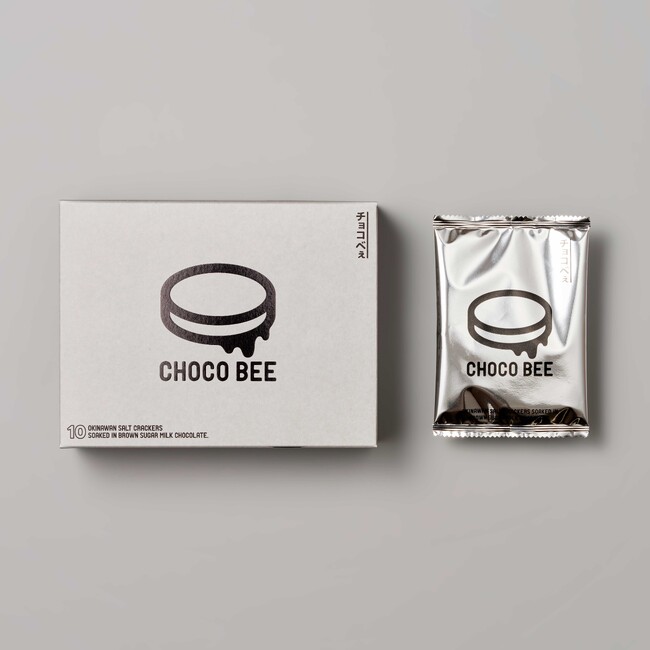 「CHOCO BEE」のロゴは沖縄出身のデザイナー久田友太氏(株式会社GYOKU)がデザイン。塩せんべいにチョコがたっぷりしみ込んでいる感じをファッショナブルなロゴで表現。シンプルだけど親しみやすさを感じるデザインとなっております。