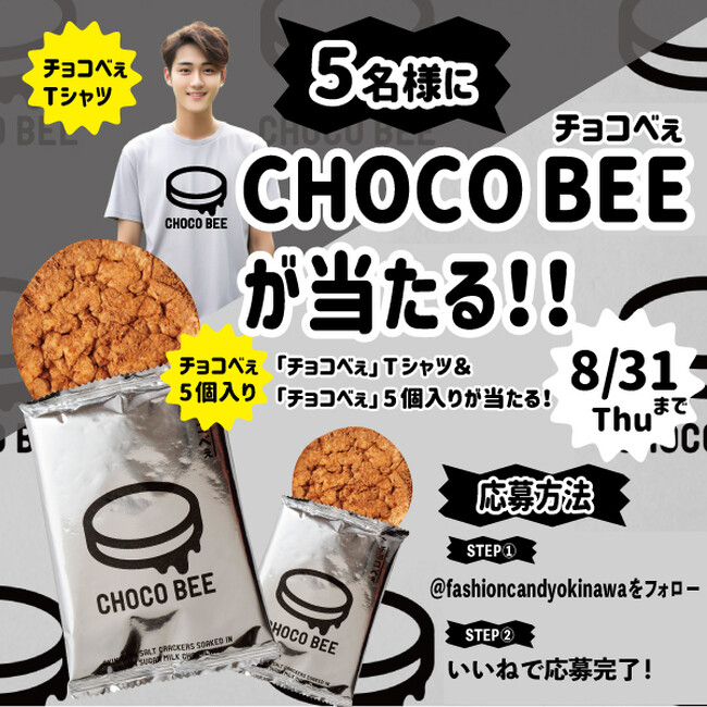 概要:ファッションキャンディ公式インスタグラムアカウント(@fashioncandyokinawa)をフォローし、対象のキャンペーン投稿をいいねした方の中から抽選で5名様に「CHOCO BEE」5個入り&オリジナルTシャツが当たる!