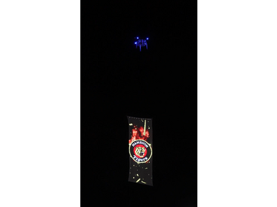ドローンの演出としては数多くのドローンが集まって映像のように見せる演出が知られていますが、この「LED VISION DRONE」は縦6.8メートル、横2.6メートルの布に17,280個のLEDを搭載しドローンに吊り下げるという手法です。 無線LED制御デバイスやバッテリーなども全てエムプラスプラス独自で設計・製作しています。