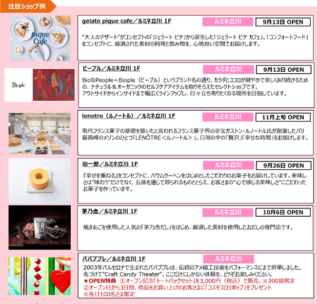 本リニューアルでは、国内でも初となる人気ブランドの新業態店舗や初のリアル店舗がオープンするほか、ルミネ・ニュウマン初、エリア初のアパレルショップ、コスメ・ビューティーショップなどが多数オープンします。また、ルミネ立川では、スイーツフロアを中心に約27ショップが入れ替わり、コロ ナ禍以降待望の大規模なリニューアルを実施します。より充実したルミネ・ニュウマンで、秋のショッピングをお楽しみください。